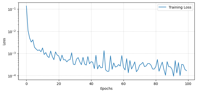 import numpy as npfrom tqdm import tqdmimport matplotlib.pyplot as pltdef create_train_state(rng, learning_rate, model, x): params = model.init(rng, x) tx = optax.nadam(learning_rate)return train_state.TrainState.create(apply_fn=model.apply, params=params, tx=tx)def mse_loss(params, batch, model):def loss_fn(params): reconstruction = model.apply(params, batch)return jnp.mean((batch - reconstruction) **2)return jax.value_and_grad(loss_fn)(params)@jax.jitdef train_step(state, batch): loss, grads = mse_loss(state.params, batch, Autoencoder()) state = state.apply_gradients(grads=grads)return state, loss# Set training parametersn_epochs =100batch_size =128learning_rate =1e-3# Initialize model and staterng = jax.random.PRNGKey(0)x = jnp.ones((batch_size, TIME_STEPS, 1))state = create_train_state(rng, learning_rate, Autoencoder(), x)# Training looplosses = []for epoch in tqdm(range(n_epochs)): epoch_losses = []for i inrange(0, len(x_train), batch_size): x_batch = x_train[i:i + batch_size]if x_batch.shape[0] != batch_size: # Skip the last batch if it is smaller than batch_sizecontinue state, loss = train_step(state, x_batch) epoch_losses.append(loss) losses.append(np.mean(epoch_losses))# Plot the training loss curveplt.figure(figsize=(9, 4))plt.semilogy(losses, label='Training Loss')plt.xlabel('Epochs')plt.ylabel('Loss')plt.grid(linestyle=":")plt.legend()plt.show()