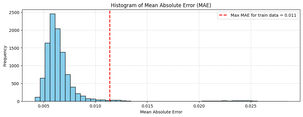 import matplotlib.pyplot as pltimport jax.numpy as jnp# Function to calculate MAEdef calculate_mae(params, data, model): reconstructed = model.apply(params, data) mae = jnp.mean(jnp.abs(data - reconstructed), axis=(1, 2))return mae# Calculate MAE for x_trainmae_train = calculate_mae(state.params, x_train, Autoencoder())treshold = jnp.max(mae_train)# Calculate MAE for x_fullmae_full = calculate_mae(state.params, x_full, Autoencoder())# Plot histogram of MAE for x_fullplt.figure(figsize=(12, 4))plt.hist(mae_full, bins=50, color='skyblue', edgecolor='black')plt.axvline(treshold, color='red', linestyle='dashed', linewidth=2, label=f'Max MAE for train data = {treshold:.3f}')plt.xlabel('Mean Absolute Error')plt.ylabel('Frequency')plt.title('Histogram of Mean Absolute Error (MAE)')plt.legend()plt.grid(linestyle=":")plt.show()