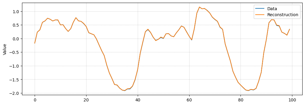 # Checking how the first sequence is learntindex = np.random.randint(len(x_full))plt.figure(figsize=(12, 4))plt.plot(x_full[index], label="Data")prediction = model.apply(state.params, x_full[index])plt.plot(prediction, label="Reconstruction")plt.ylabel("Value")plt.xlabel("")plt.legend()plt.grid(linestyle=":")plt.show()